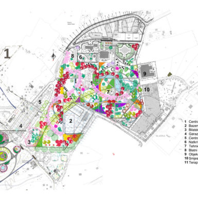 Analiza lokacije nametnula je građevinske strukture koje se uklapaju u padine, formirajući posebne zone (ušuškana dvorišta), park koji teče iz jednog u drugi dio povezujući na integralan i sveobuhvatan način ćeline i ambijente u prostoru. Otvorene, čiste geometrijske forme sa vizurama na okolni prostor imitiraju susjedna brda i privlače ih oku posmatrača, bilo da je objekat hotelskog sadržaja ili pak namijenjen rehabilitaciji. Objekti svojim odnosom definišu susjedstvo kao bitan elemenat ugodnog boravka, formirajući ,,dvorište,,, park koji je prostor za ugodno druženje, relaksaciju, šetnju, igru djece. Volumetrija objekata, kroz visinski položaj, insolaciju i vizure na okolna brda, omogućava da se iz svakog prostora pružaju nezaboravni pogledi i potpuno uživanje u kontaktu sa prirodom. Objekti su postavljeni tako da prate padinu, dok istovremeno svojim volumenom i međusobnim odstojanjima dozvoljavaju da park ima najrazličitije vizure.