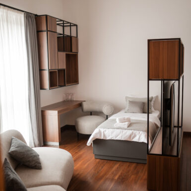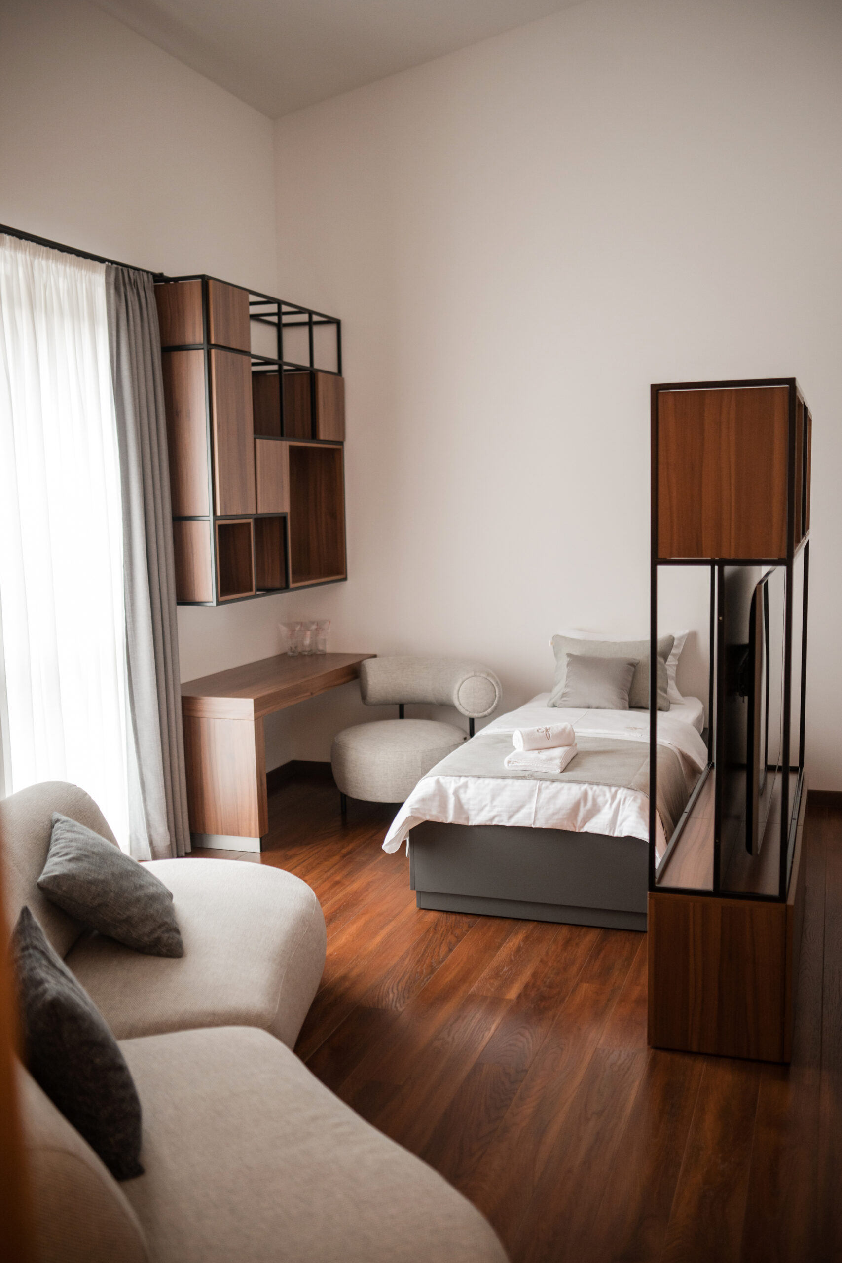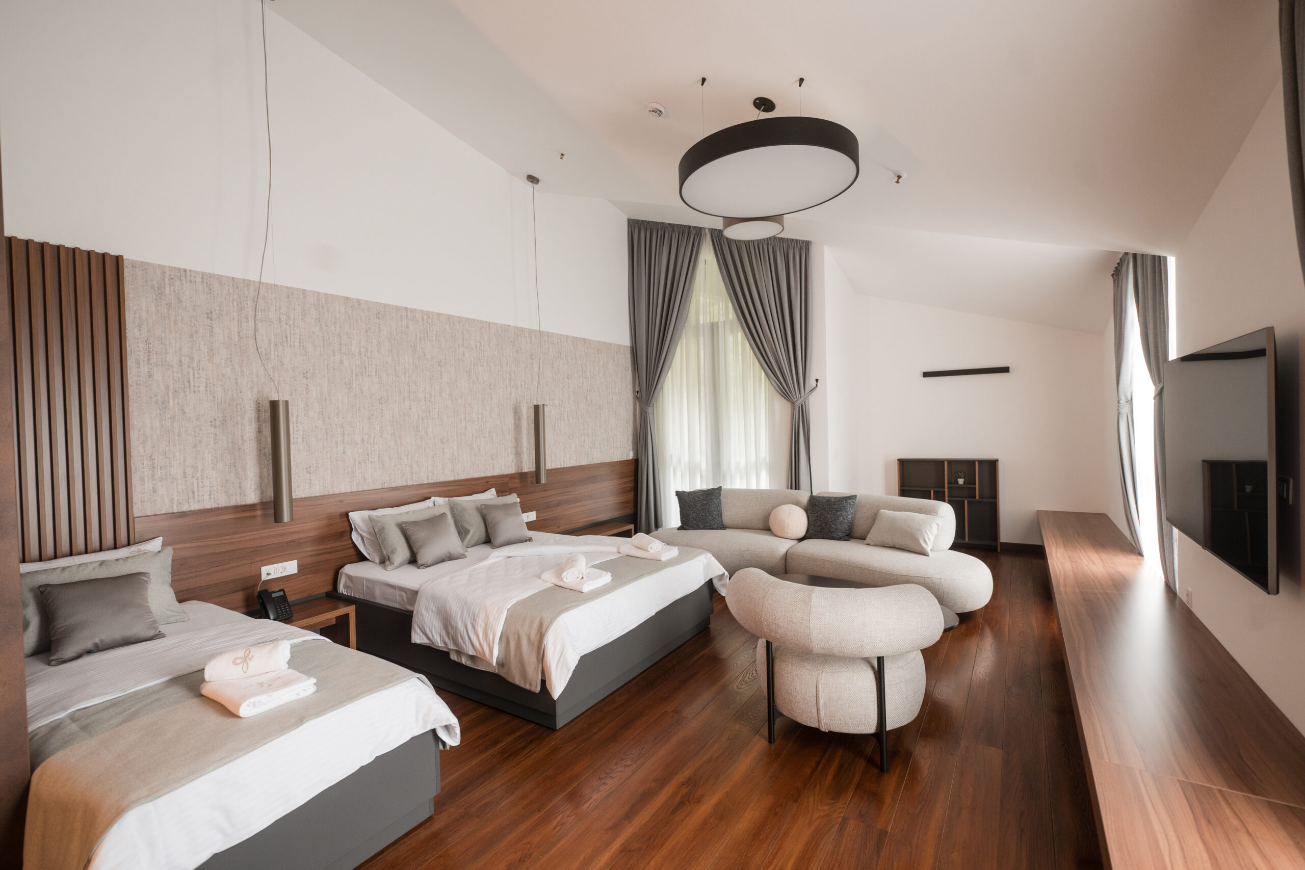 Smještajni dio objekta obuhvata ukupno 24 sobe, od čega je 19 dvokrevetnih i 5 trokrevetnih. Sobe su opremljene namještajem jednostavnih linija, u istom materijalnom i kolorističkom konceptu kao i zajednički prostori, sa akcentom na funkcionalnost i komfor korisnika.
