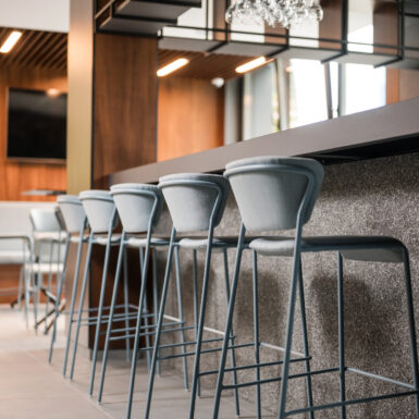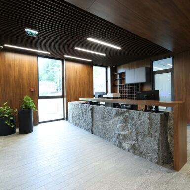 Ulazni prostor sa recepcijom formiran je kao centralna komunikaciona tačka objekta, sa masivnim pultom obloženim prirodnim kamenom. U neposrednoj blizini smješten je kafe-bar kao prostor za kraći boravak korisnika.