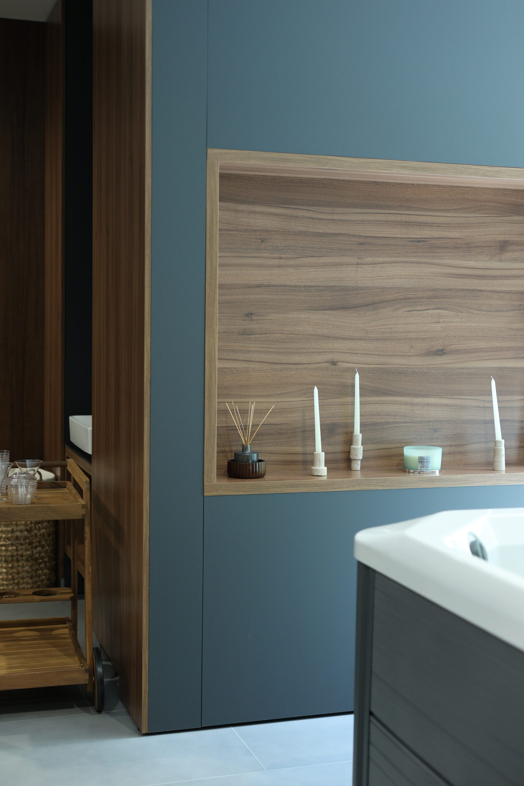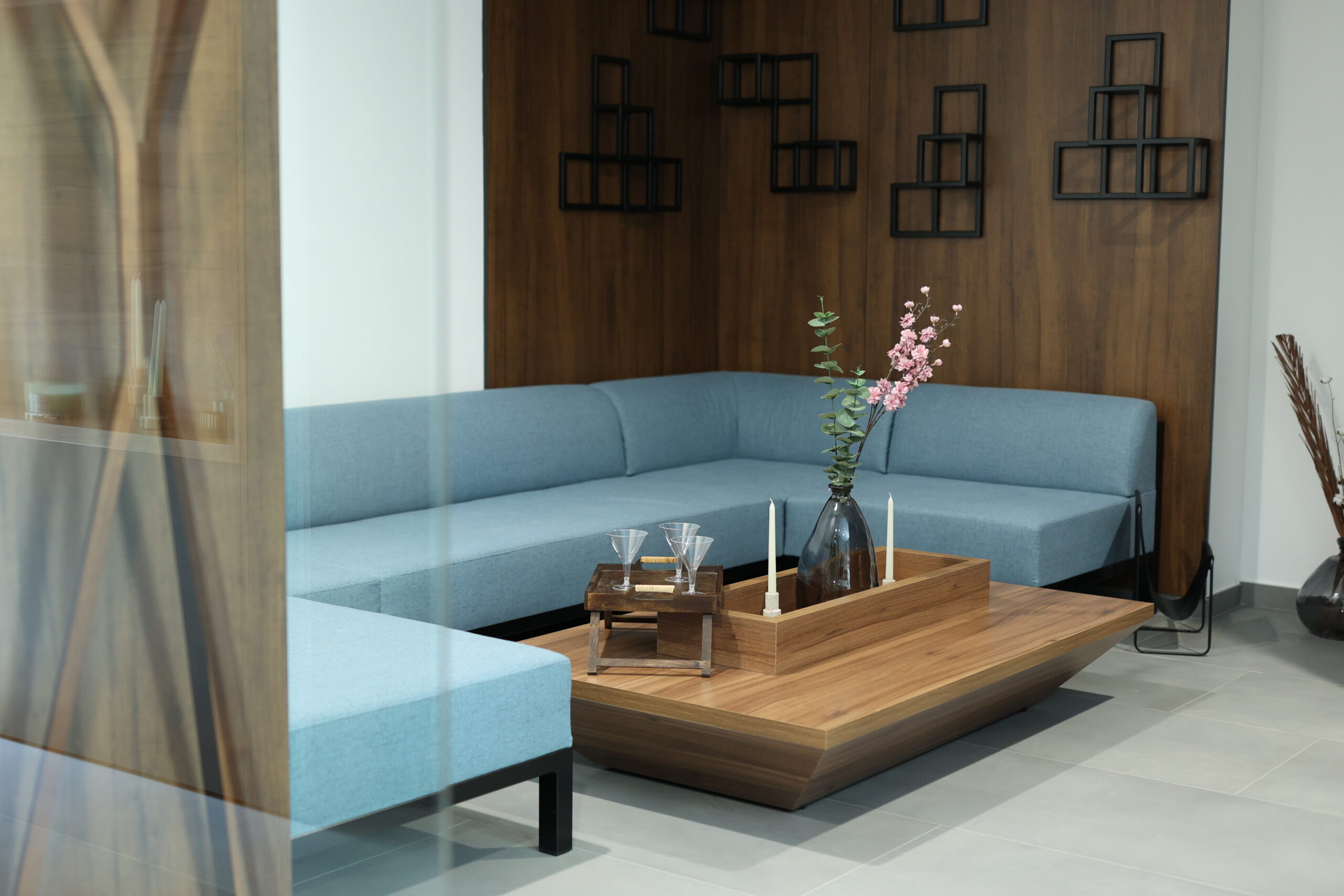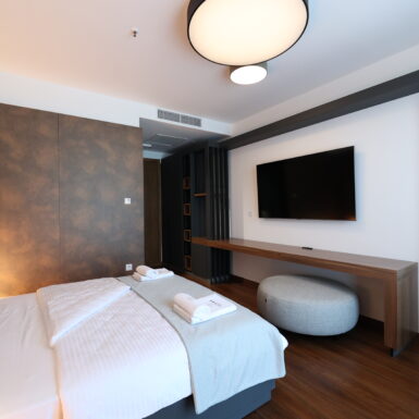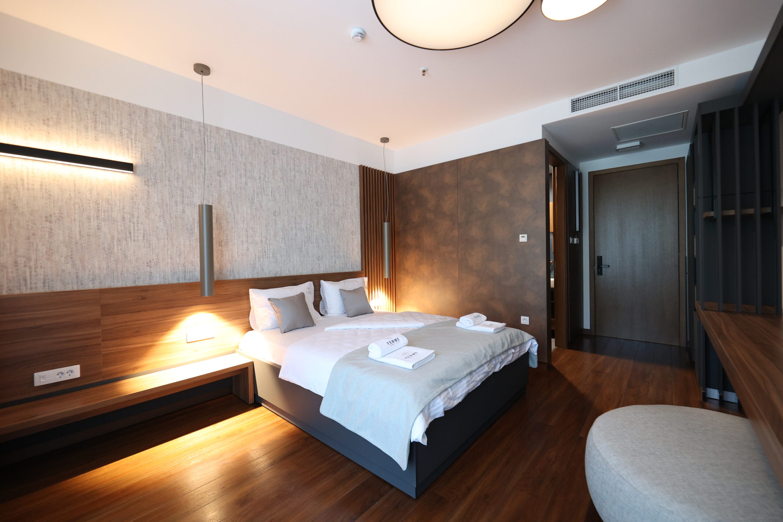 Namještaj i fiksni elementi izvedeni su u kombinaciji antracit sivih tonova i drvnog dekora oraha, čime se postiže uravnotežen kontrast između toplih i neutralnih površina. Podne i zidne obloge u javnim zonama izvedene su od kamena i keramičkih materijala otpornim na vlagu, dok su u mirnijim zonama zastupljene drvene i tekstilne obloge sa akustičkim svojstvima.