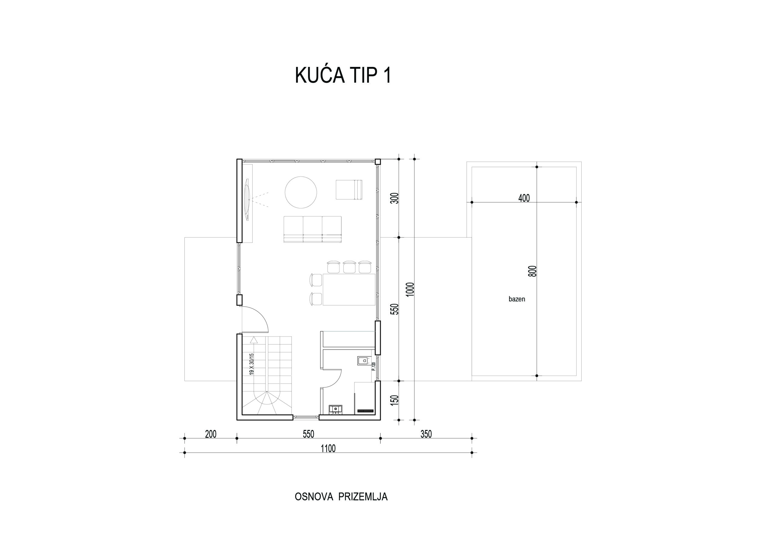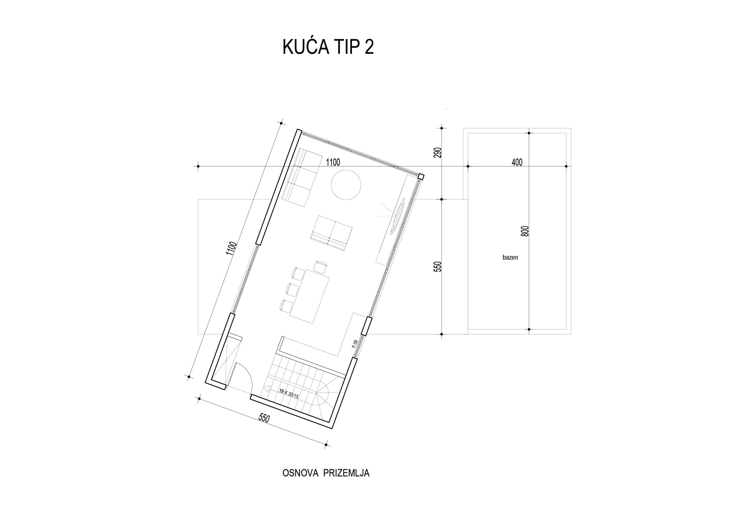U prizemlju ćemo naći ugodne smještajne jedinice za boravak danju i noću sa bazenom na terasi ili đakuzijem a na suterenu noćne prostore. Svi prostori, posebno oni javni, posjeduju opuštenu atmosferu. Spektakularni vidici nepravilno su raspoređeni, podovi prizemlja od grubog kamena kao i terase a na spratovima hrastovi podovi kao i plafoni i stepenišne ograde.