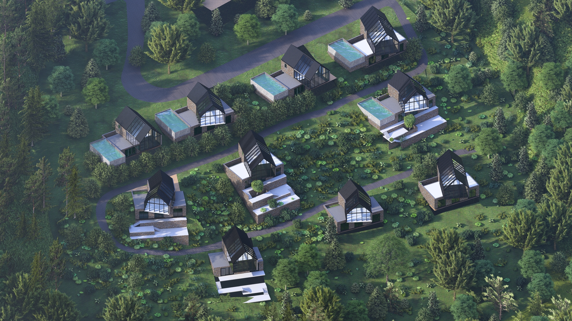 Sada je to skup objekata od sirovog kamena, sve su im strane nepravilno perforirane staklom, kao i krovovi. Pravougaonici su to u tri dimenzije, tri tipa rasporeda prostora, sa ili bez bazena. Osnovna pravilna forma je decentno isprekidana, prvo zbog padine, onda ulica koje se teško formiraše pa oblikovanja vanjskog prostora koji je kod svakog od objekata potpuno drugačiji.