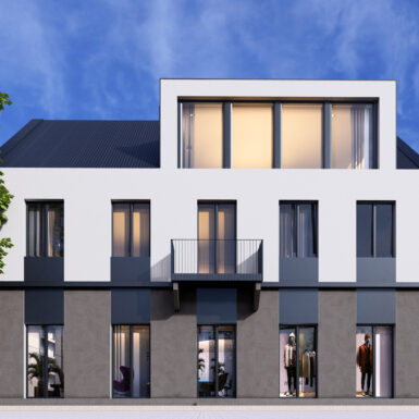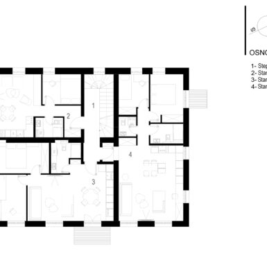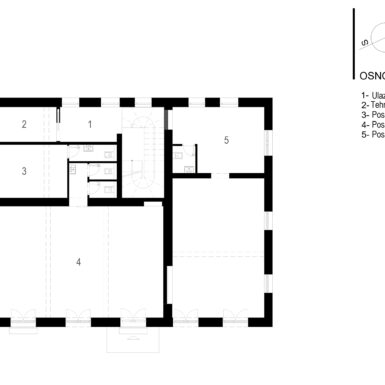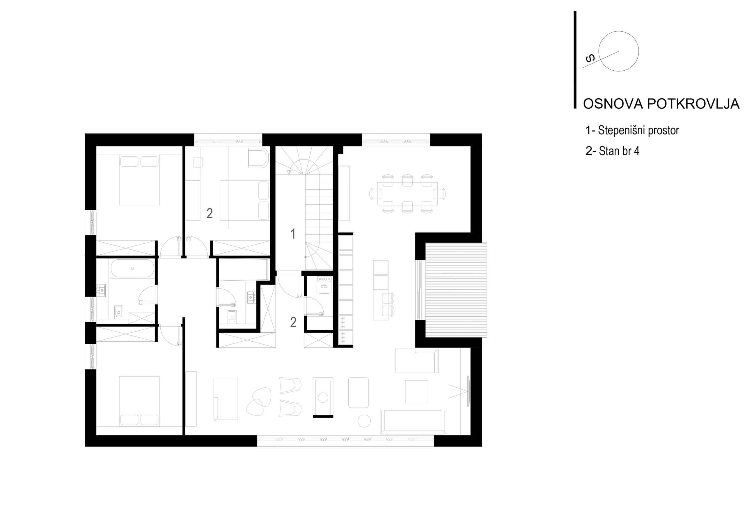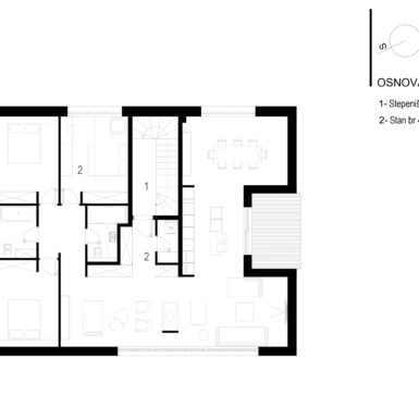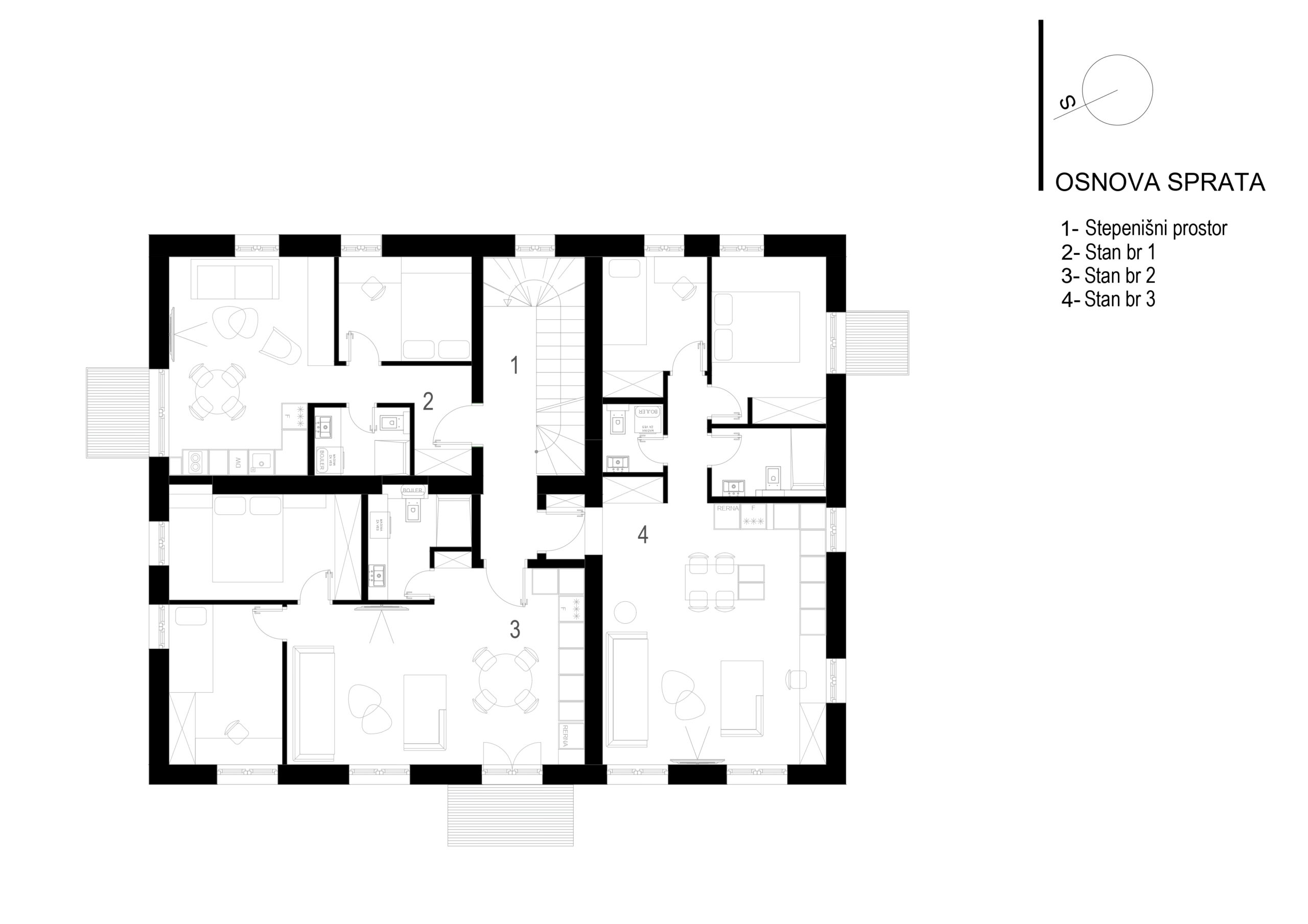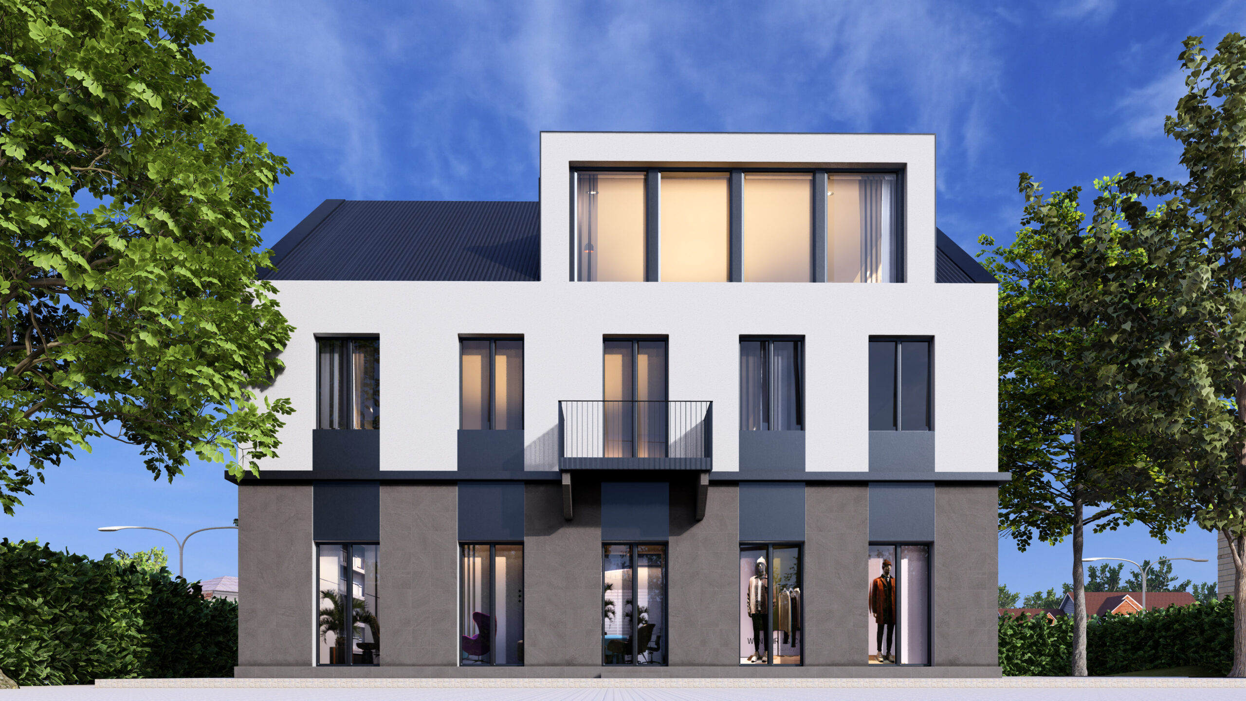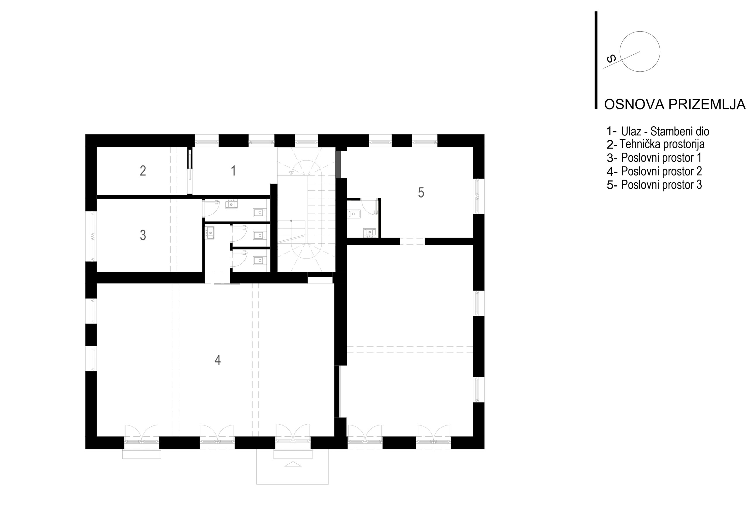 Ideja da u prizemlju bude poslovni prostor namijenjen restoranu koji bi maksimalno uvažavao drveće na parceli, pogotovo u šetnici a time se i definiše preostali mogući prostor za izgradnju.  Takođe da bi se povećala transparentnost prostora povećani su otvori koji puštaju svjetlost u sve dijelove objekta i omogućavaju vizuelnu i fizičku povezanost sa okolinom. Glavni ulaz u stambeni dio na spratu i potkrovlju, gdje su smješteni tri odnosno sa potkrovljem četiri apartmana je na istočnoj strani. A glavni ulaz za prizemlje je ulazni tzrg, mjesto okupljanja, ulazna terasa prema šetnici na južnoj strani.