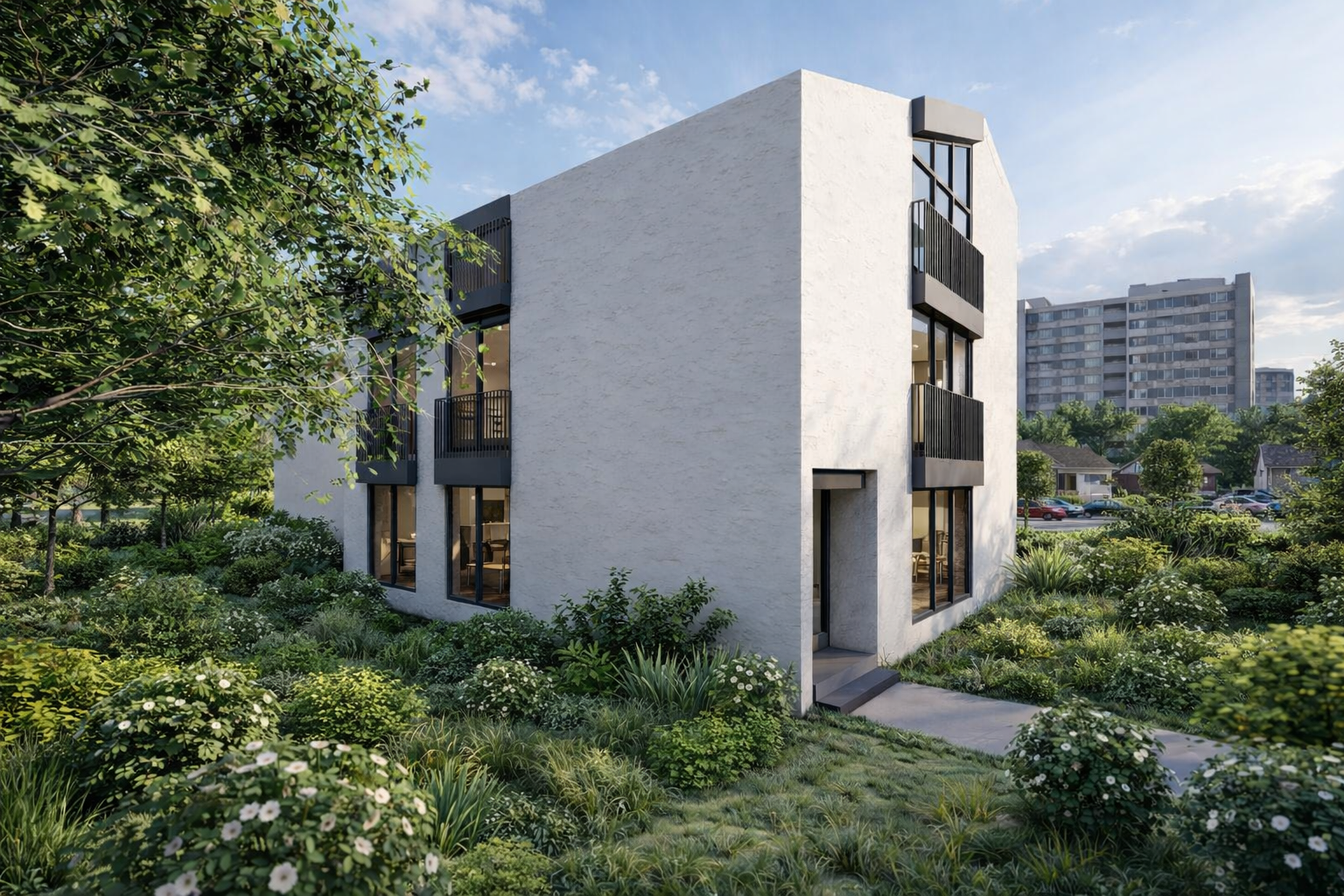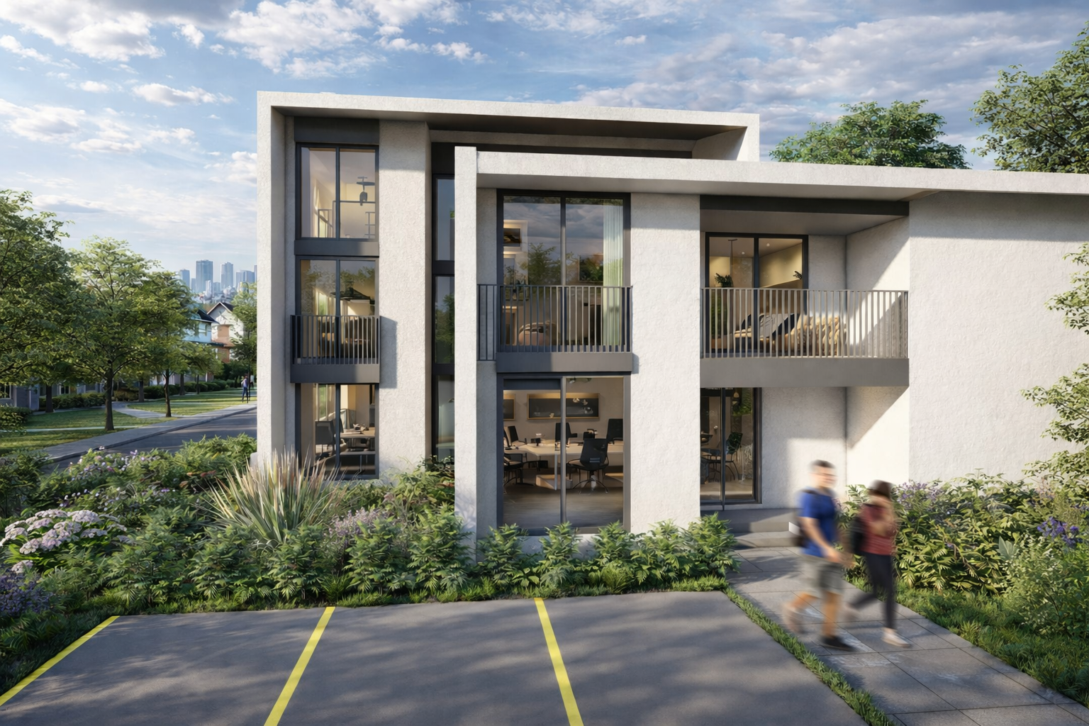 Objekat je natkriven kosim, dvovodnim krovom, sa završnom oblogom od aluminijumske PREFA krovne i fasadne šindre, čime se postiže savremen izgled i dugotrajnost materijala. Pristup objektu ostvaren je direktno sa ulice Rade Vranješević, a u okviru parcele obezbijeđen je parking prostor za ukupno pet vozila, namijenjen kako poslovnom, tako i stambenom dijelu objekta.