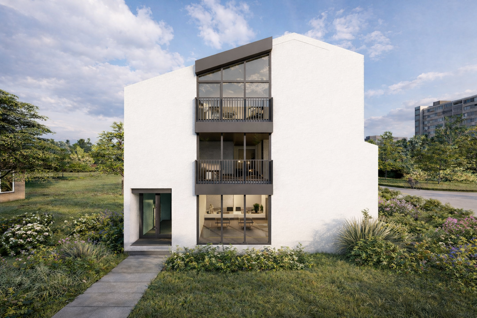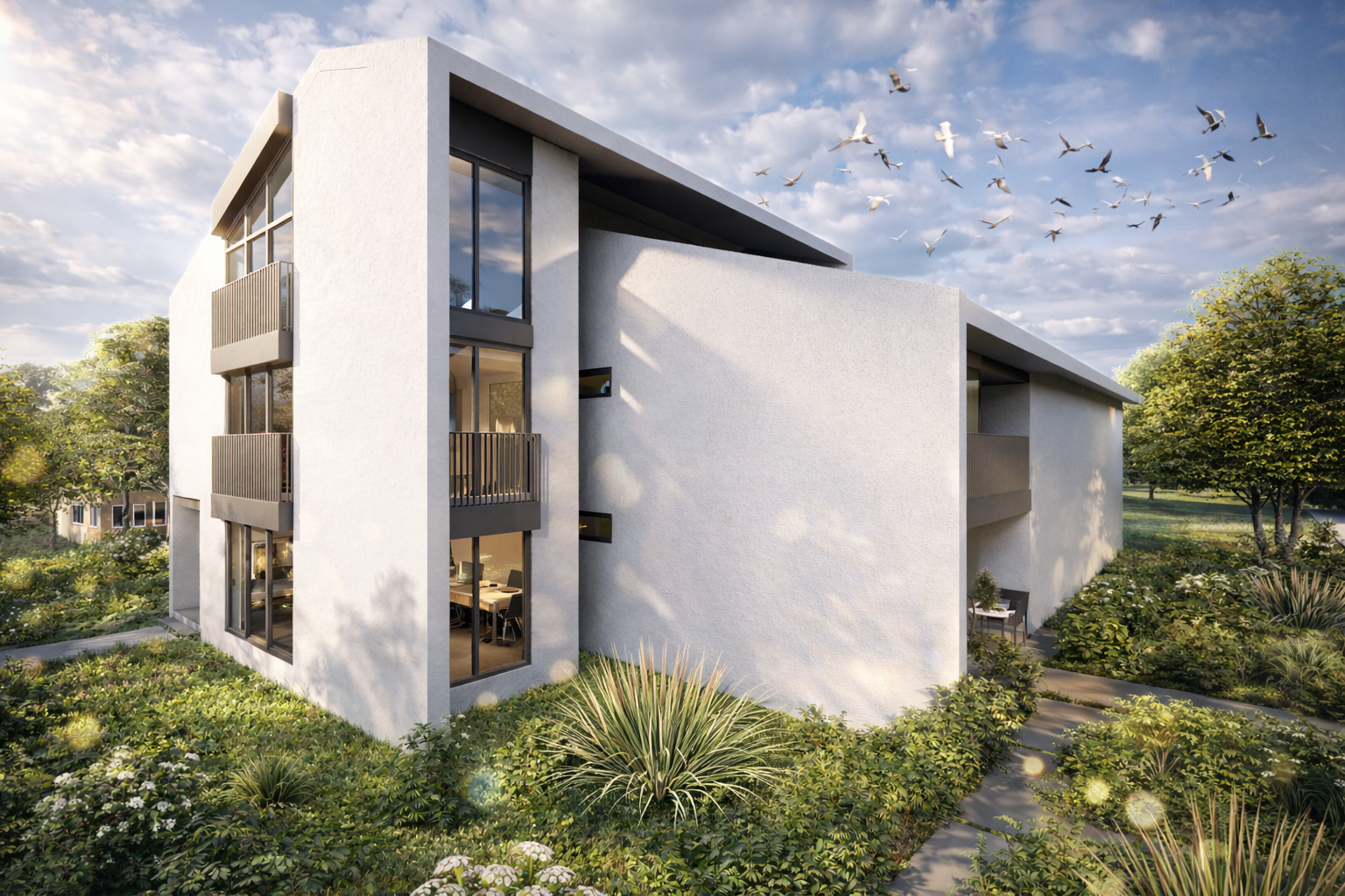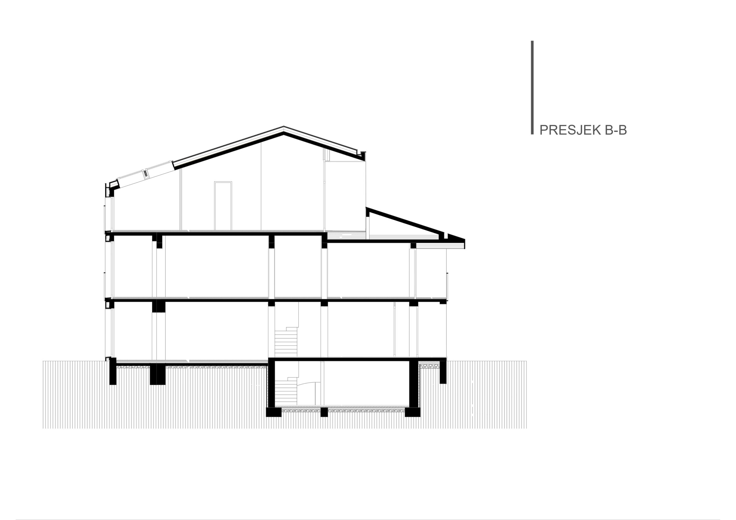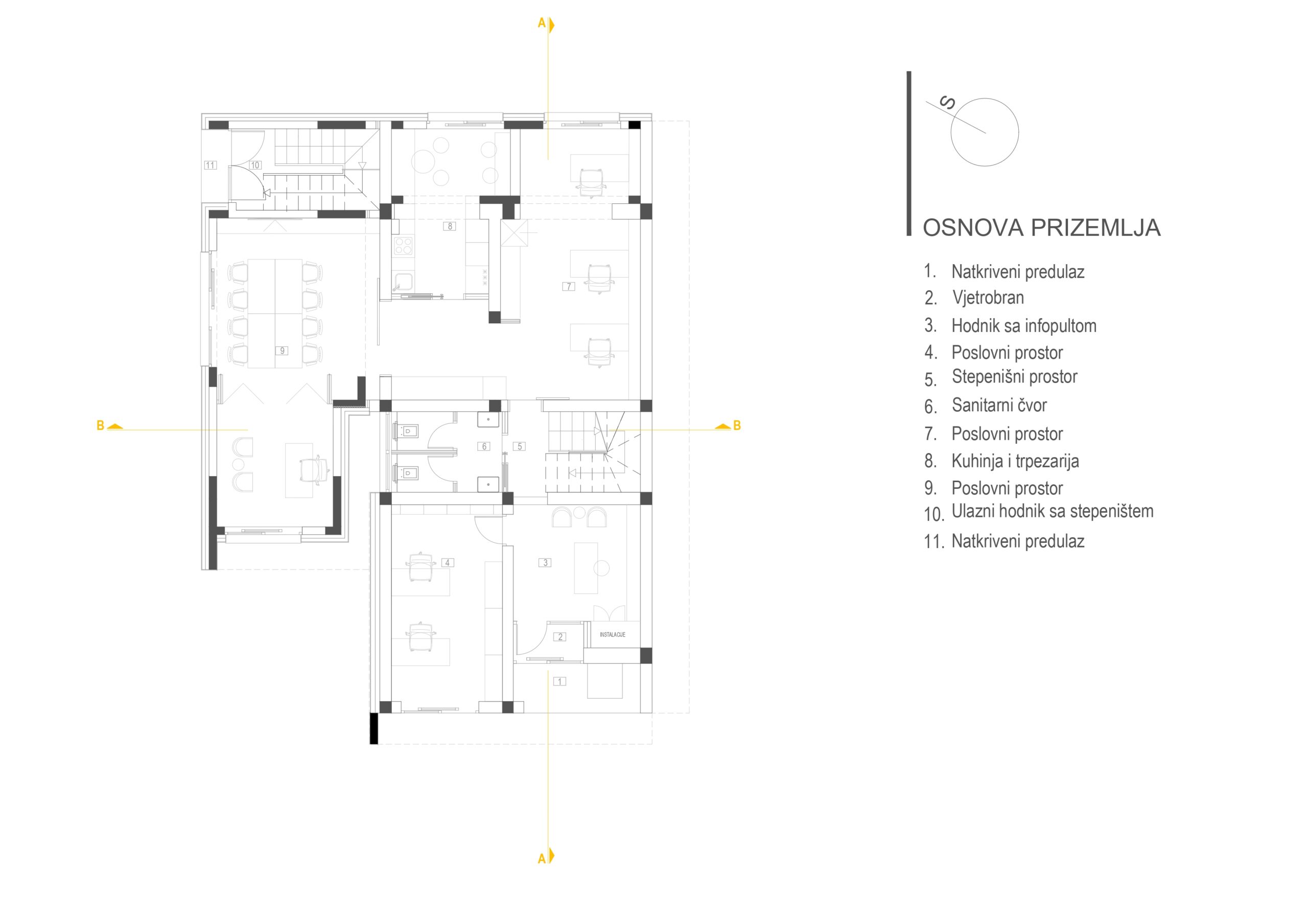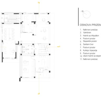 Podzemna etaža namijenjena je pomoćnim i tehničkim prostorijama, čime su servisne funkcije diskretno izmještene iz glavnih zona korištenja. U prizemlju je smješten poslovni dio objekta, sa natkrivenim ulazom i prijemnim prostorom, kancelarijama različitih kapaciteta, prostorom za prezentacije, kao i zonom za odmor zaposlenih sa kuhinjom i trpezarijom. Organizacija prostora omogućava efikasan rad, ali i kvalitetne uslove za boravak i komunikaciju.