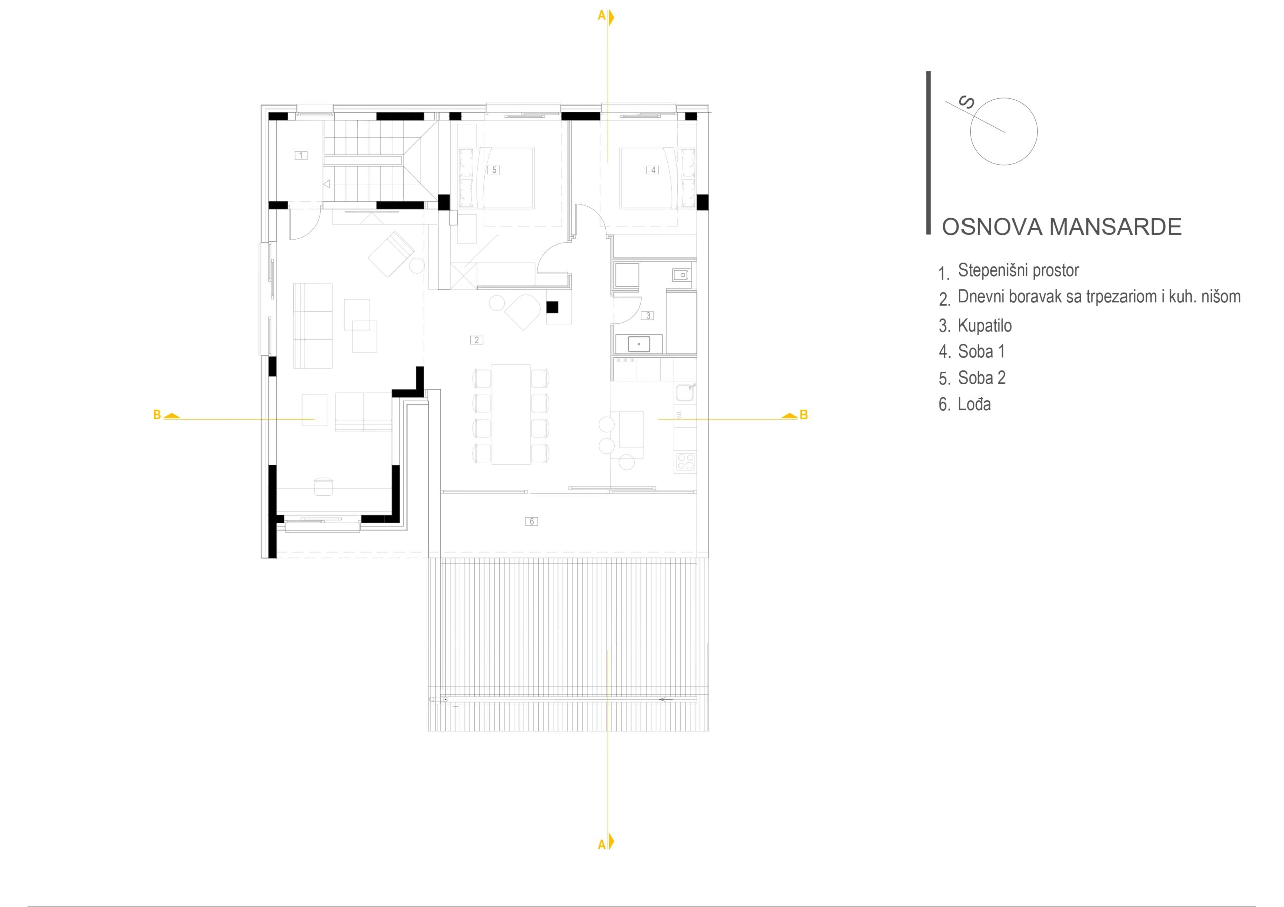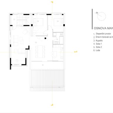 Projektom je predviđena i rekonstrukcija postojećeg stanja, koja podrazumije suggests uklanjanje dijela postojećeg objekta, vanjskog stepeništa i krova, kako bi se omogućila nadogradnja mansarde i formiranje nove prostorne i funkcionalne cjeline.