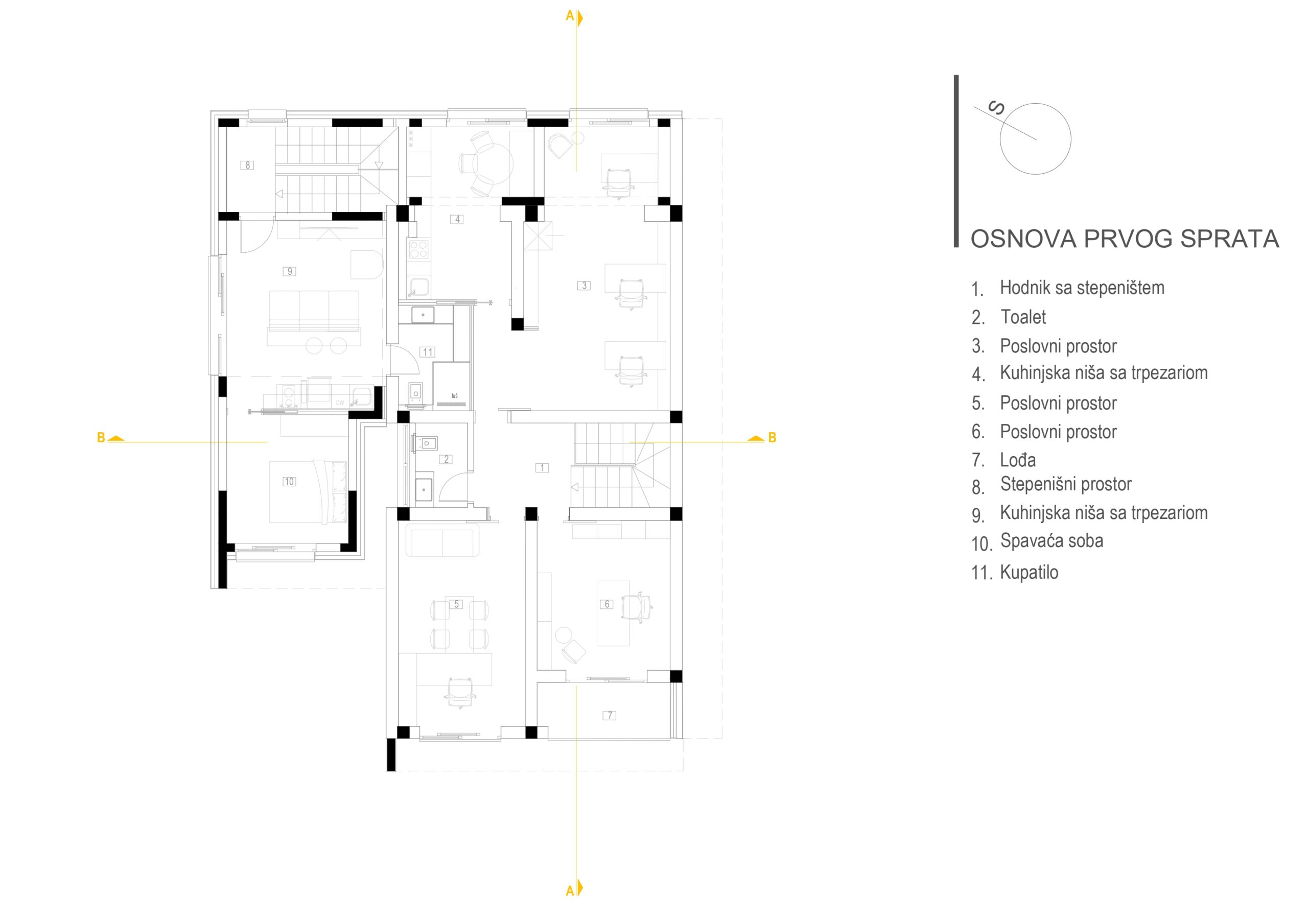Na prvom spratu nalazi se upravni dio sa kancelarijama rukovodstva i zaposlenih, uz dodatni prostor za odmor. Na istoj etaži započinje stambena zona, kojoj se pristupa zasebnim stepeništem, čime je obezbijeđena jasna podjela između poslovnog i privatnog dijela objekta. Stambeni prostor je u potpunosti smješten u mansardi, gdje se nalazi funkcionalan stan sa dnevnim boravkom, kuhinjom i trpezarijom, izlazom na terasu, te dvije spavaće sobe sa pripadajućim kupatilom.